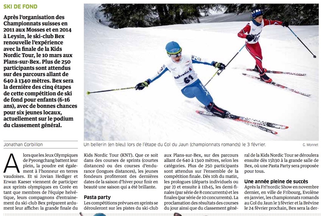 Merci à l’hebdomadaire Le Régional, de nous avoir consacré une double page dans l’édition d’aujourd’hui, on vous le rappelle, c’est le samedi 10 mars qu’aura lieu la finale de la Kids Nordic Tour aux Plans-sur-Bex, organisé par le ski-club Bex.